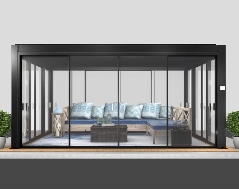 Skjutdörrar till pergolan ger en smidig och elegant lösning för att skapa en flexibel uteplats. De skyddar mot väder och vind samtidigt som de bevarar den öppna känslan.