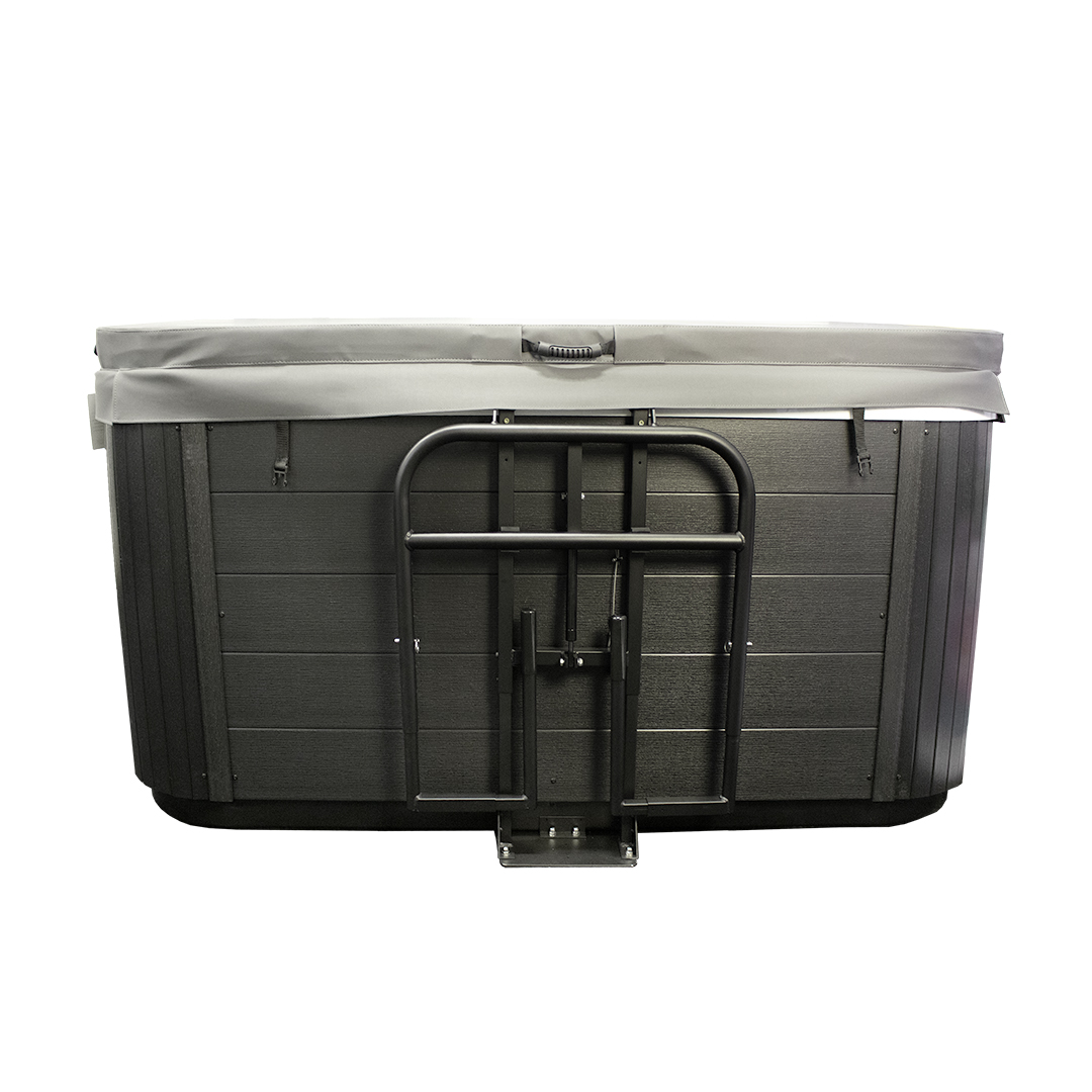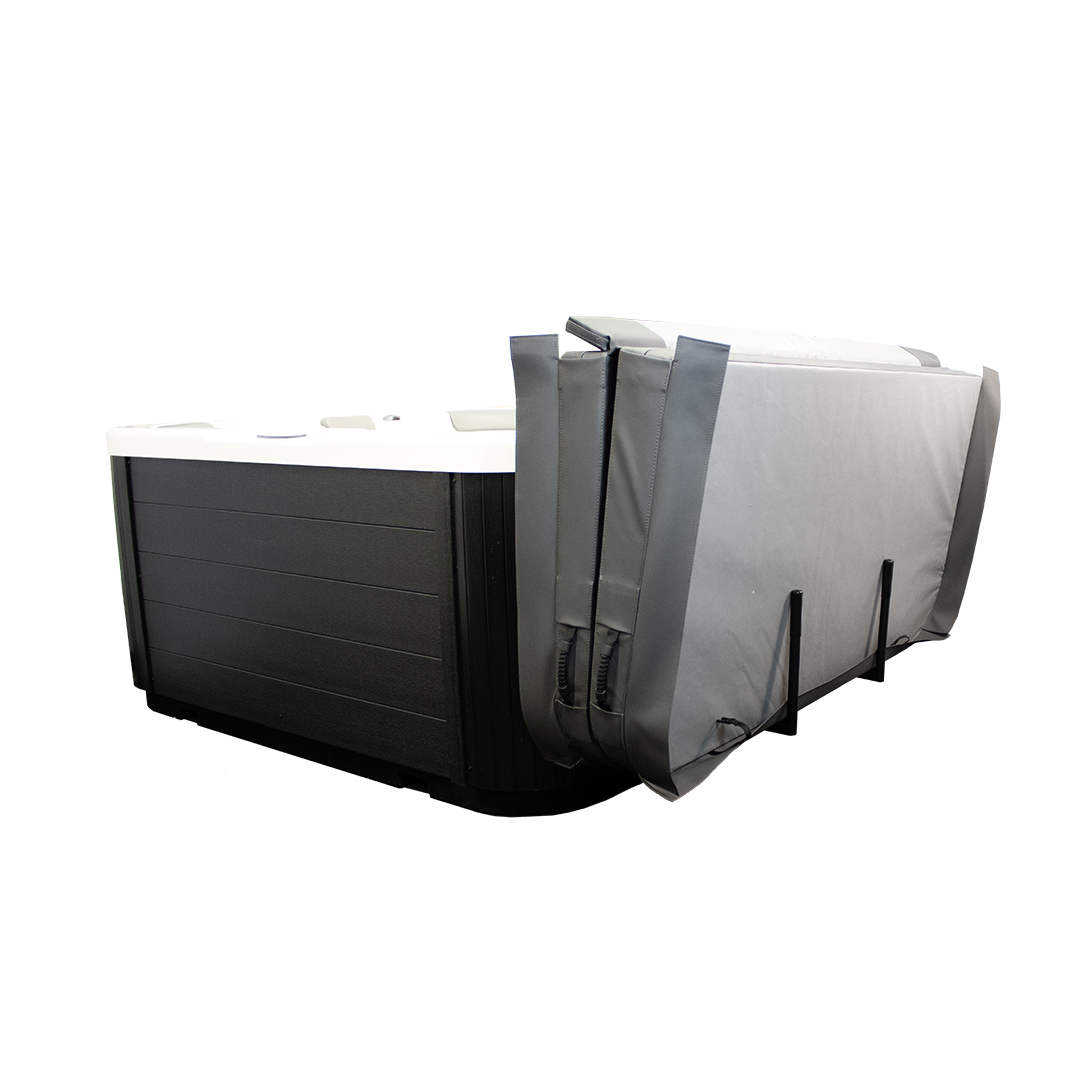 När locket ska tas bort viks locket och skjuts in i locklyftens armar. Med hjälp av dämpare trycks locket enkelt ner och hänger på sidan av spabadet under tiden du badar.